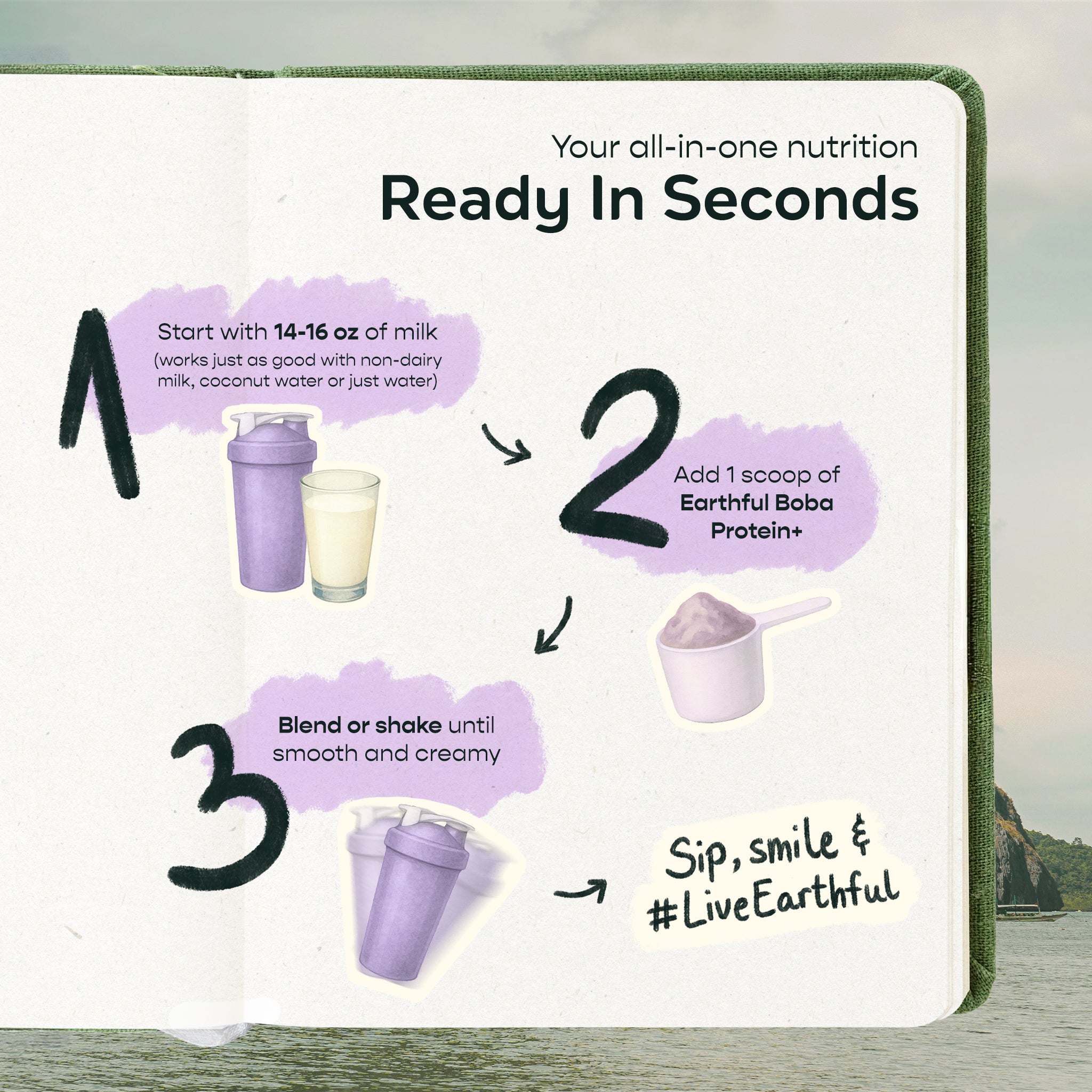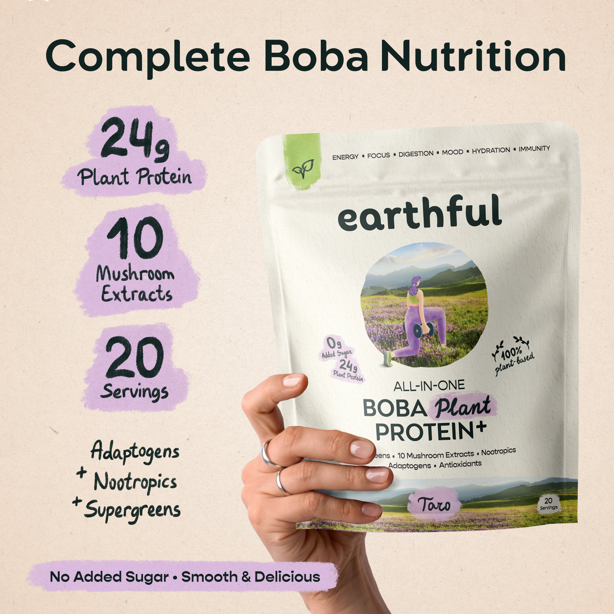FROM SOIL TO SOUL – Earthful unites boba-inspired flavor, plant protein, mushrooms, supergreens, adaptogens, and antioxidants into one indulgent taro protein shake. Effortless, enjoyable, and outrageously delicious.