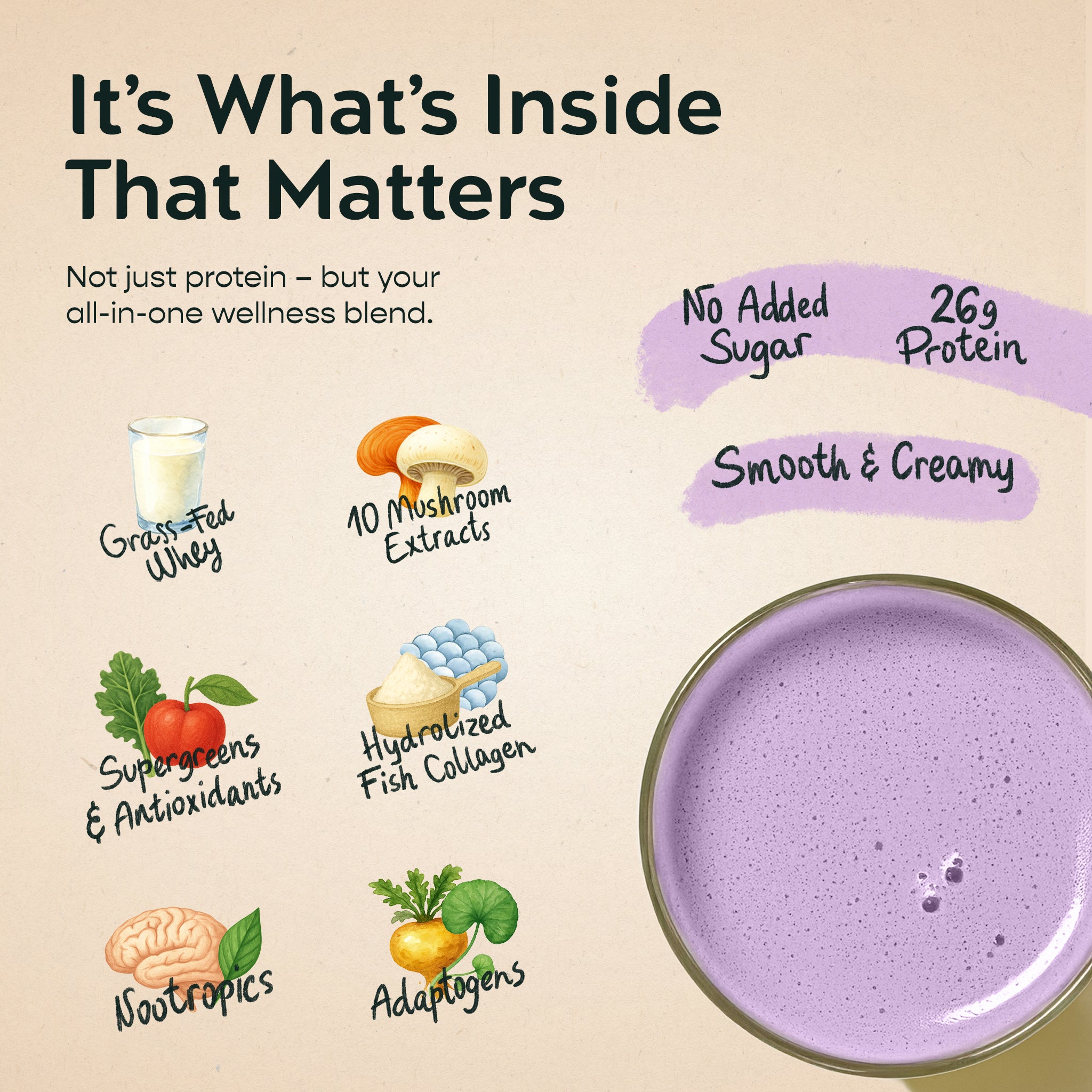 100% Grass-Fed Whey Protein (26g) + Marine Collagen + 10 Mushroom Extracts + Supergreens + Antioxidants + Nootropics